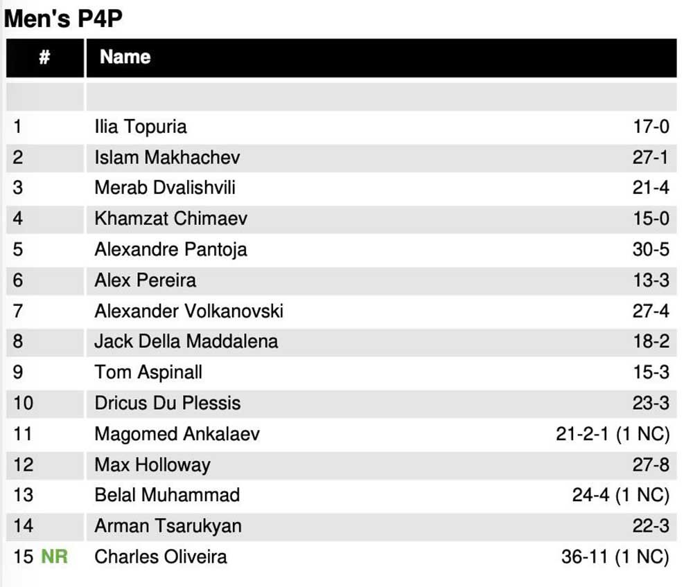 UFC Fight Night 261 turnirining asosiy jangida polshalik Mateush Gamrotni muddatidan oldin mag'lubiyatga uchratgan CHarlz Oliveyra yana P4P reytingiga qaytdi. Braziliyalik sobiq UFC chempioni 15-o'rinda qayd etildi. SHu paytgacha Top-15`ni yakunlab turgan qozog'istonlik SHavkat Rahmonov esa reytingni tark etdi.