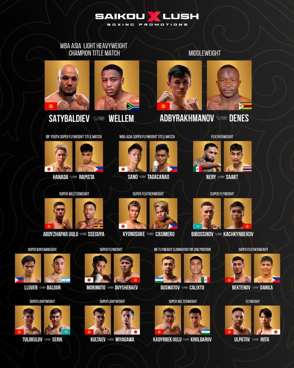 Bundan tashqari, prof boks kechasida havaskor boksdagi natijalari bilan yaxshi tanish bo'lgan qozog'istonlik Saken Bibosinov, faoliyati davomida yaponiyalik mutlaq jahon chempioni Naoya Inoue bilan jang qilgan Luis Neri ham ringga chiqadi.
