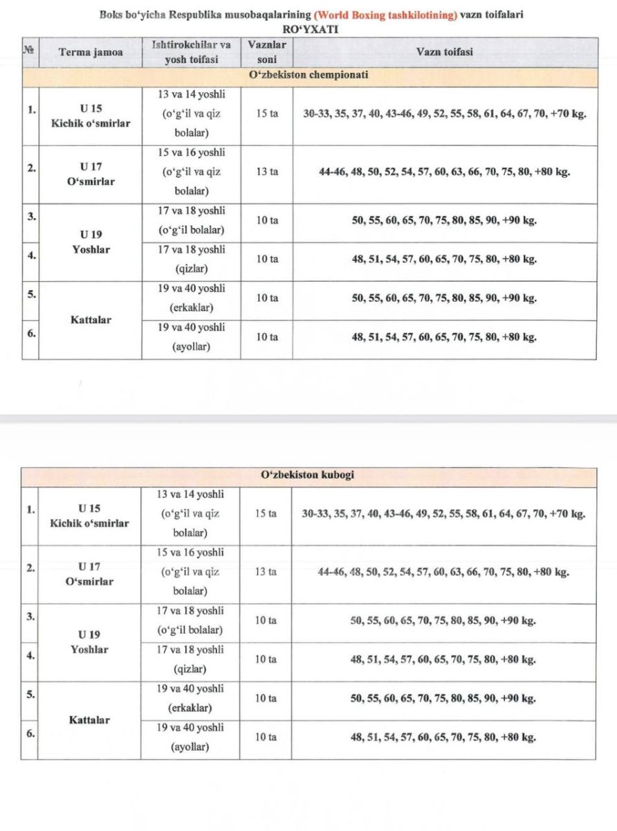 Malum qilinishicha, endilikda mahalliy musobaqalar World Boxing tashkilotining vazn toifalari bo'yicha o'tkaziladi.