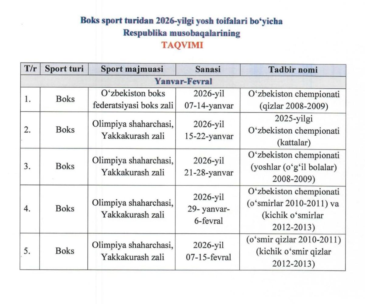 Xabarda aytilishicha, joriy yilgi kattalar o'rtasidagi O'zbekiston chempionati 2026 yilning 15-22 yanvar kunlari poytaxtimizdagi Olimpiya shaharchasi hududida joylashgan "Yakkakurash majmuasi"da bo'lib o'tadi.