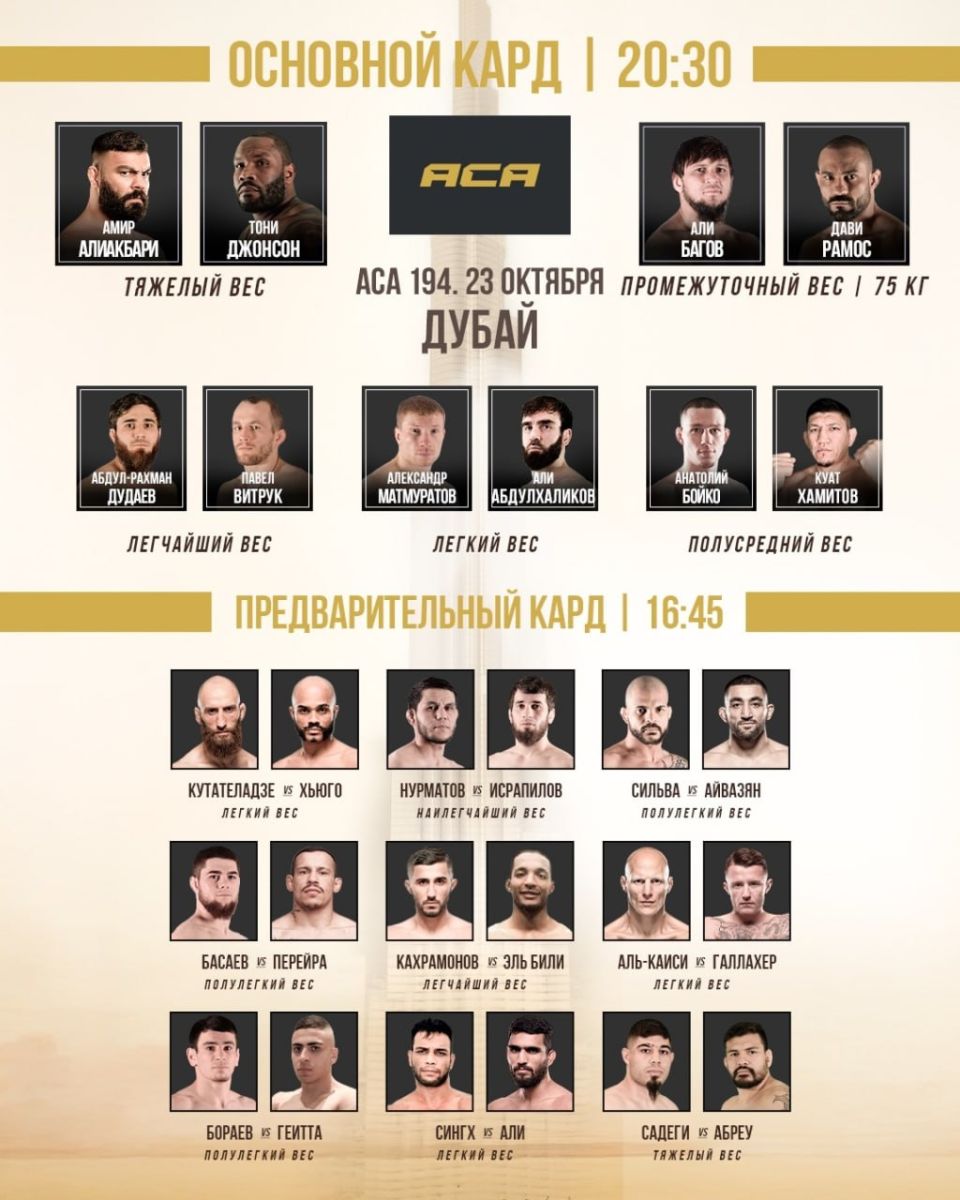 Sobiq UFC jangchisi hisoblangan Qahramonov ACA 194 turnirida misrlik Omar El Bili (6-3) bilan to'qnash kelsa, Nurmatov rossiyalik tajribali Umalat Israilov (17-5)ga qarshi bahs olib boradi.
