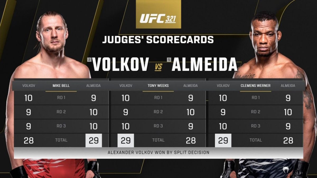 Unda rossiyalik og'ir vaznli sportchi Aleksandr Volkov Braziliya vakili Jailton Almeydaga qarshi bahs olib bordi. 3 raundlik to'liq davom etgan jangda Volkov 29-28, 29-28, 29-28 hisobida o'z g'alabasini rasmiylashtirdi.