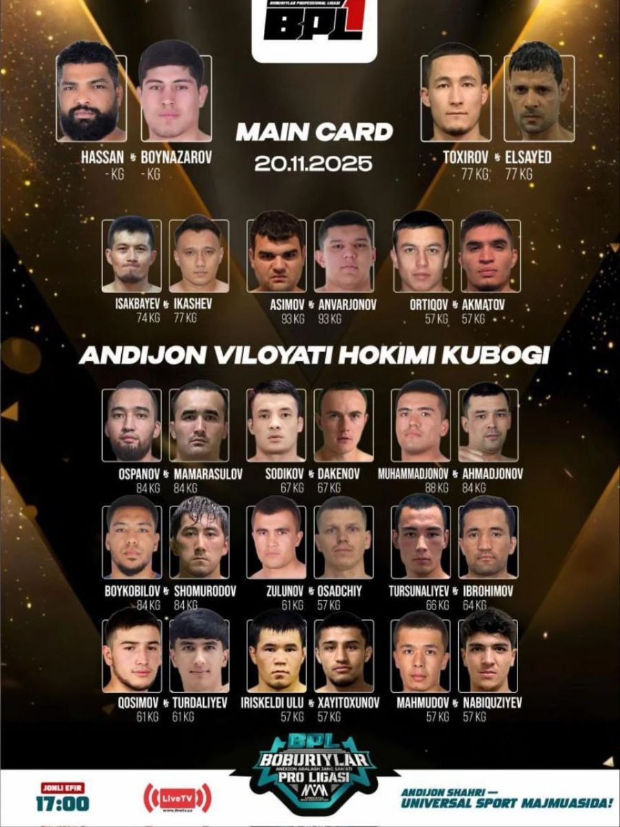 Uning dastlabki turniri 20 noyabr kuni Andijon shahridagi "Universal" sport kompleksida o'tkaziladi. Oqshomning markaziy jangida BAAning UAE Warriors Ligasi chempioni, andijonlik Xotambek Boynazarov oktagonga ko'tariladi.