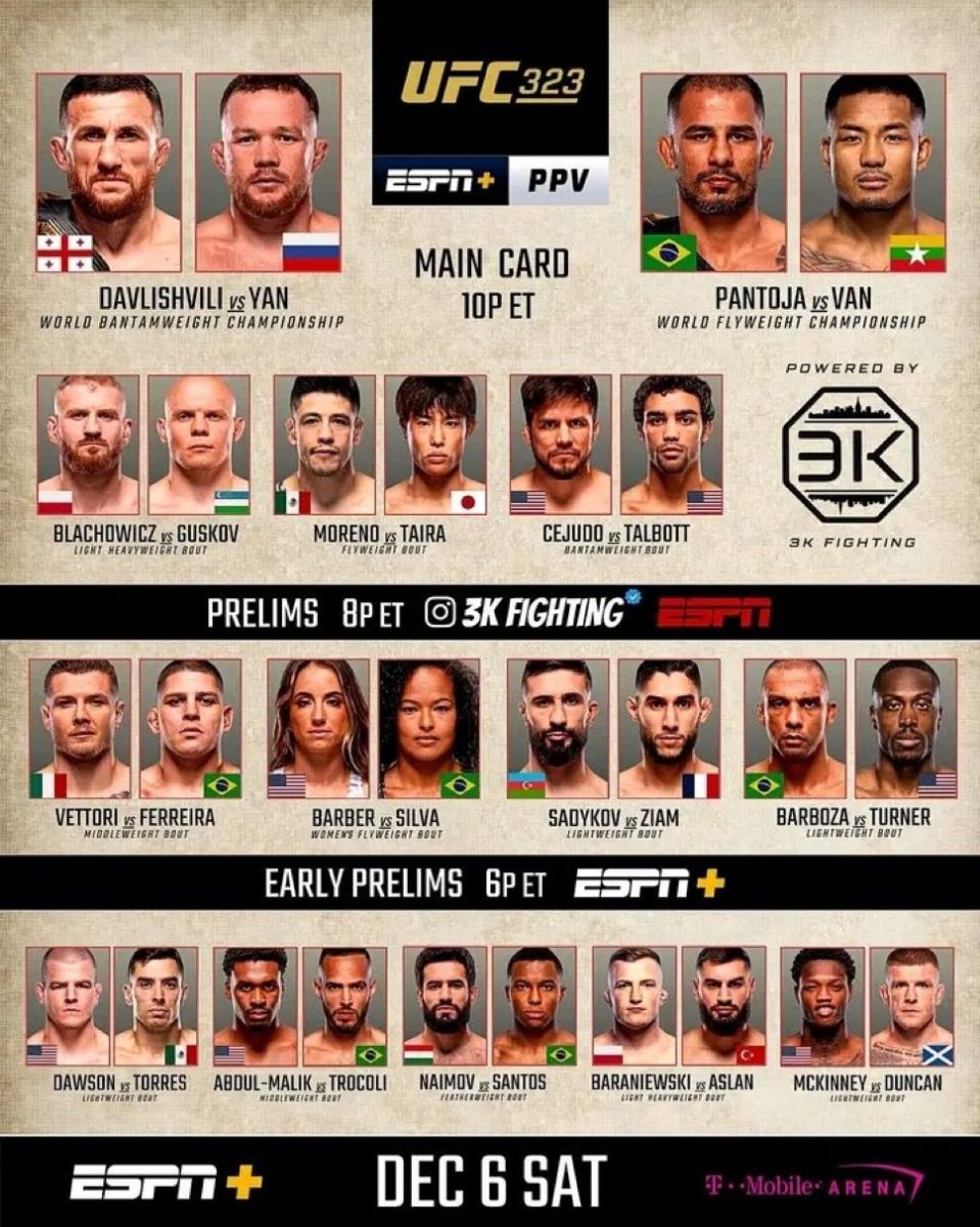 AQSHning Las-Vegas shahridagi T-Mobile Arena majmuasida bo'lib o'tadigan yilning so'nggi raqamli turniri — UFC 323 turnirining asosiy kardida hamyurtimiz Bogdan Guskov chiqish qiladi.
