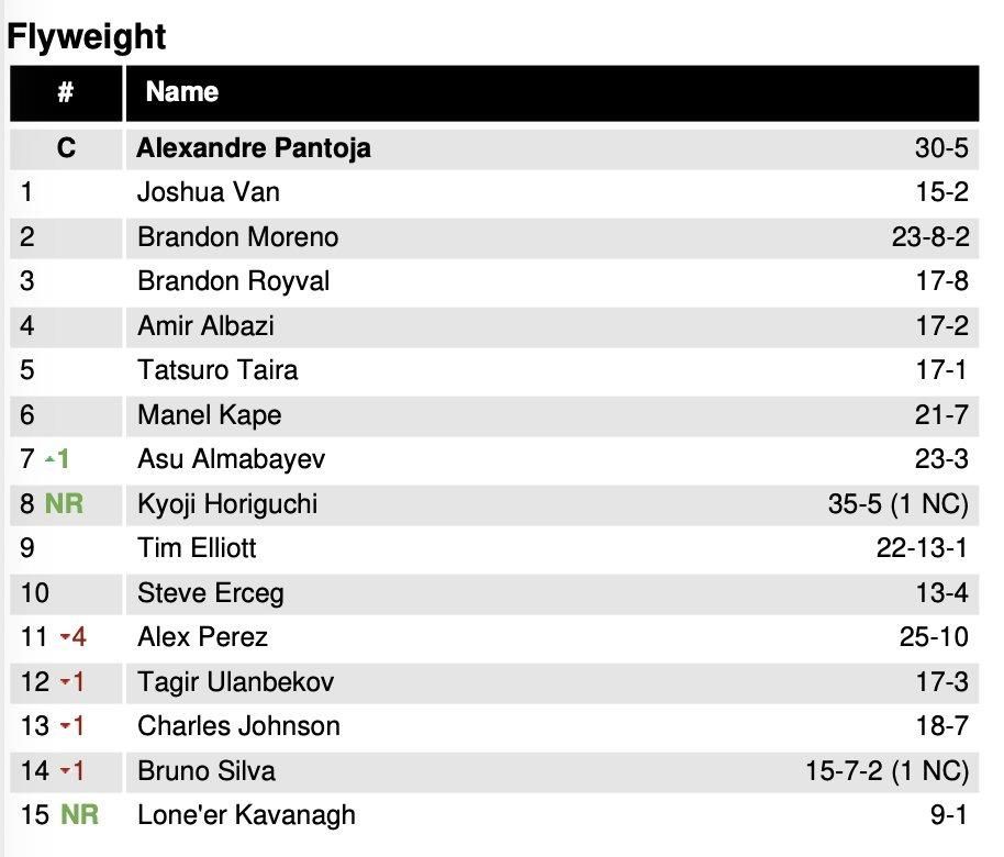 Yangilanishlarga ko'ra, o'ta engil vazn toifasida faoliyat olib boruvchi qozog'istonlik aralash yakka kurash ustasi Asu Almabaev bir pog'ona yuqorilab, yana ettinchi o'ringa qaytdi.