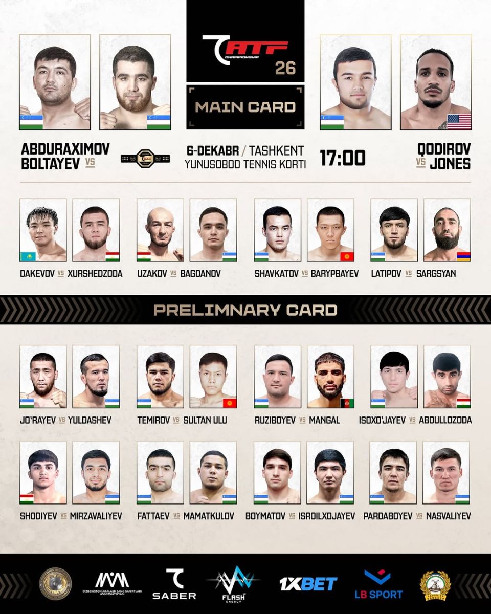 Markaziy jang hamyurtlarimiz Islom Boltaev va SHukurjon Abdurahimov o'rtasida kechadi. Jang o'rta vazn toifasidagi ATFC chempionlik kamari uchun o'tkaziladi.